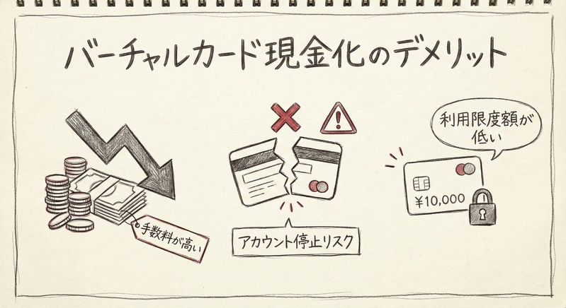 バーチャルカード現金化には、主に以下3つのデメリットもあるため要注意です。